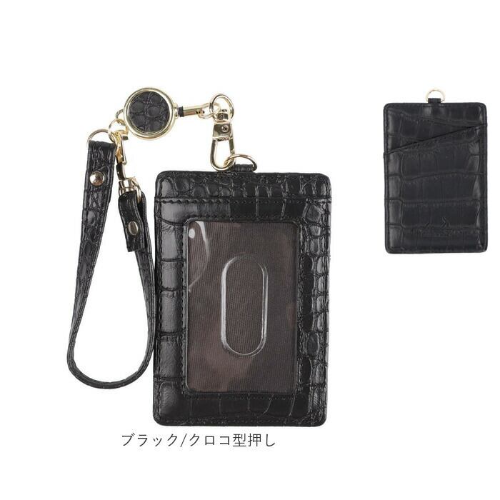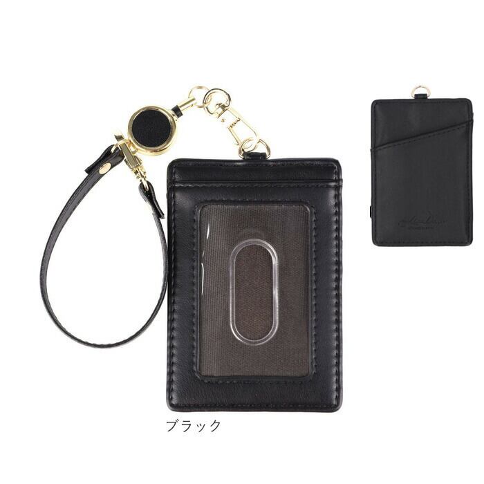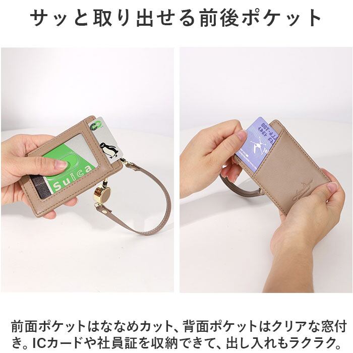 ・前面ポケットはななめカット、背面ポケットはクリアな窓付き。ICカードや社員証を収納できて、出し入れもラクラク。