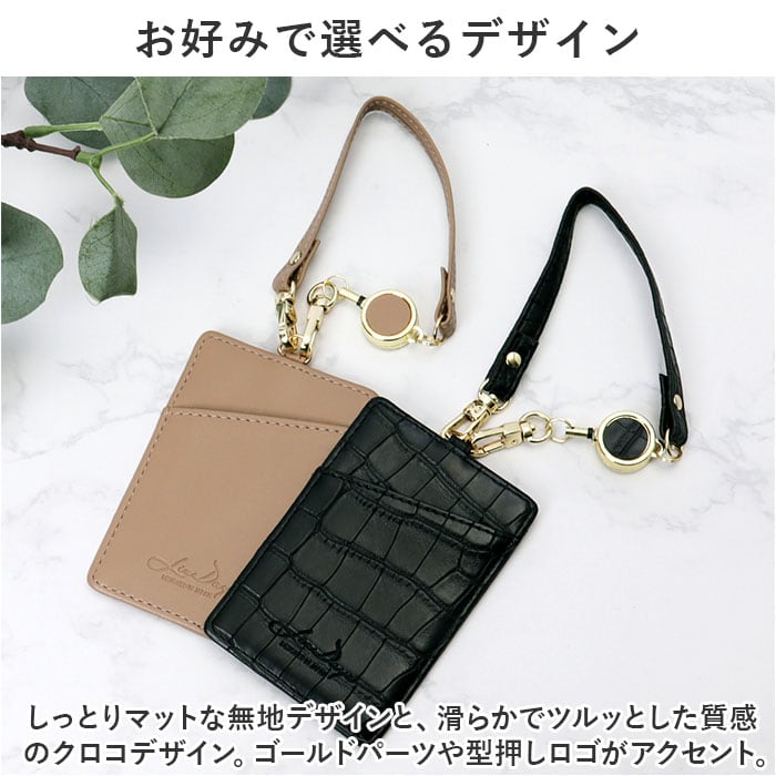 ・しっとりマットな無地デザインと、滑らかでツルッとした質感のクロコデザイン。ゴールドパーツや型押しロゴがアクセント。