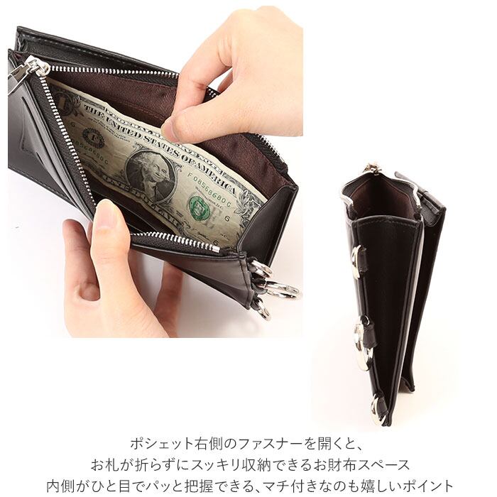 ・ポシェット右側のファスナーを開くと、お札が折らずにスッキリ収納できるお財布スペース。内側がひと目でパッと把握できる、マチ付きなのも嬉しいポイント。