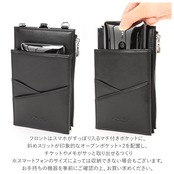 ・フロントはスマホがすっぽり入るマチ付きポケットに、斜めスリットが印象的なオープンポケット×2を配置し、チケットやメモがサッと取り出せるつくり。(※スマートフォンのサイズによっては収納できない場合もございます。お手持ちの機器を事前にご確認の上、お買い求めください。)