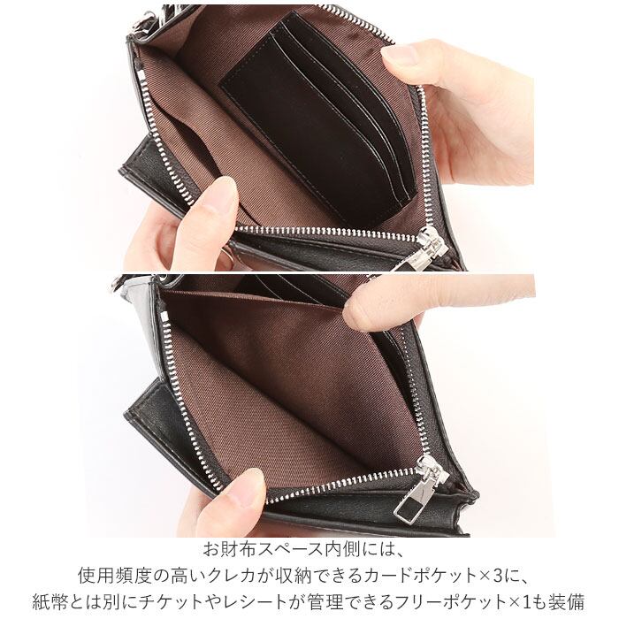 ・お財布スペース内側には、使用頻度の高いクレカが収納できるカードポケット×3に、紙幣とは別にチケットやレシートが管理できるフリーポケット×1も装備。